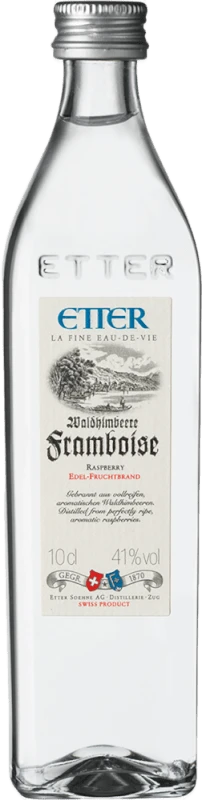Der erstklassige Etter Framboise Schweizer Himbeergeist 0,1 l von Etter – La Fine Eau de Vie aus der Schweiz fließt in strahlendem glasklaren Farbton ins blankpolierte Glas und verführt zum ersten Schluck.