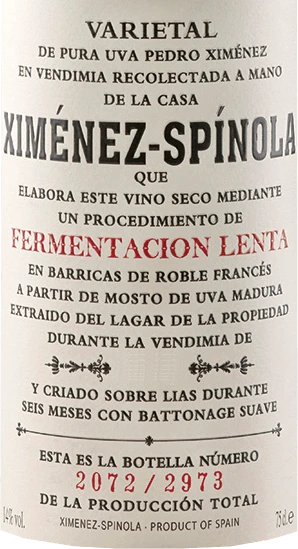 Der Fermentacion Lenta von Ximénez-Spinola strahlt in einem hellen Gold im Glas, während er mit seinem herrlichen Bouquet verführt. Dieses wird dominiert von den Aromen französischer Barriquefässer im Zusammenspiel mit dem harmonischen Noten von Rosinen und Backpflaumen.