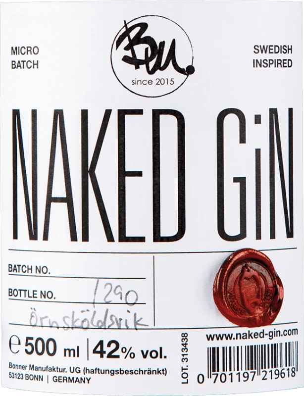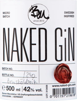 Aus der kreativen Feder von Bonner Manufaktur aus Deutschland fließt mit diesem naked GIN ein vielversprechender Gin ins kristallklare Glas und becirct auf Anhieb das Auge geneigter Spirituosenliebhaber mit brillanter glasklarer Farbe.